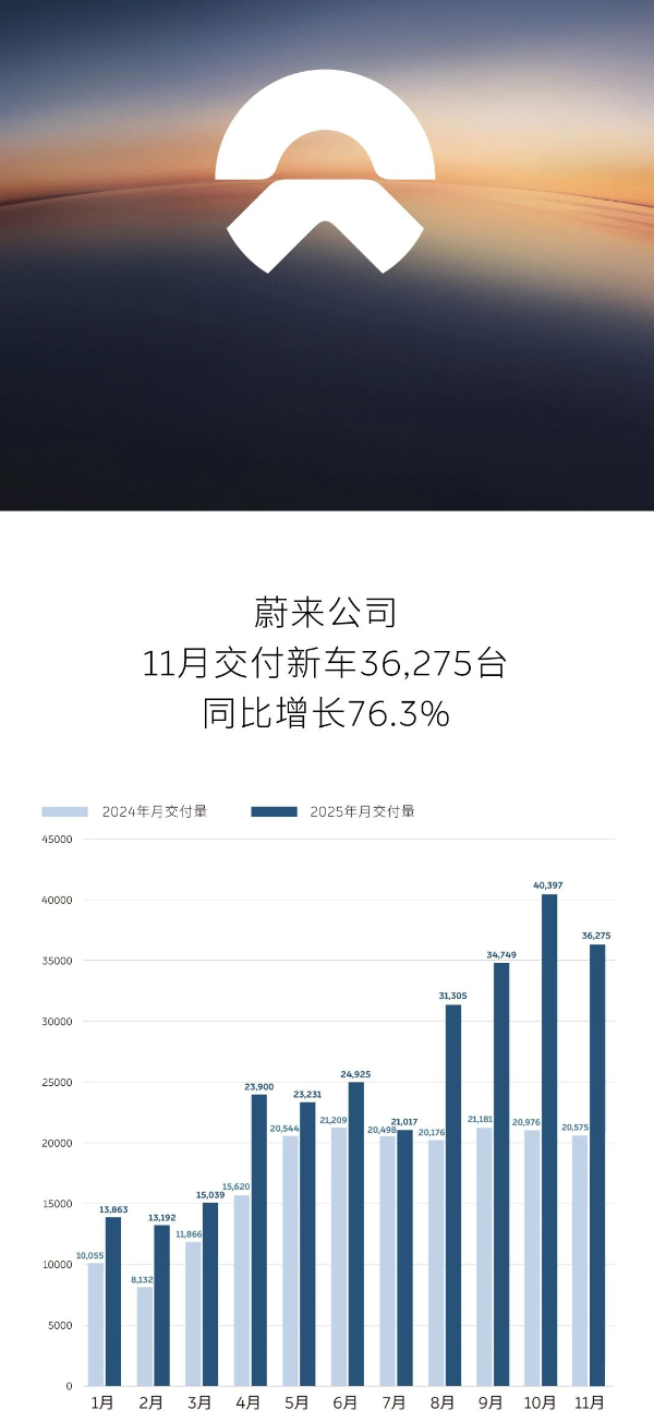 TOP 13 蔚来汽车:3.62万辆,多品牌战略见效蔚来汽车11月新能源销量表现亮眼,同比增长76.3%,交付新车36,275台。自今年8月以来,蔚来汽车交付量已连续四个月超过3万台。